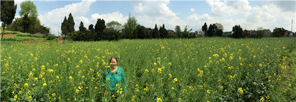 圖為:蔣西民的妻子在自家的油菜地里開心的笑著