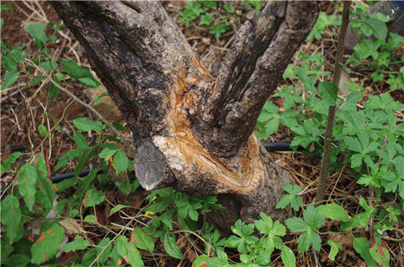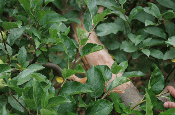 上圖為腐爛病導致這棵蘋果樹皮被刮掉大面積