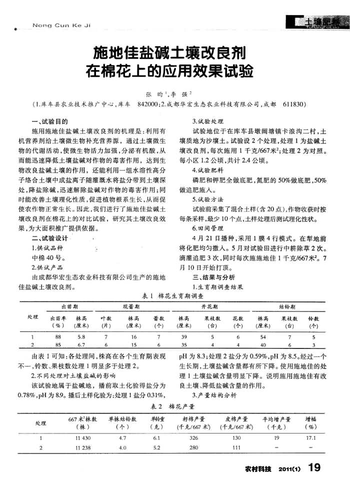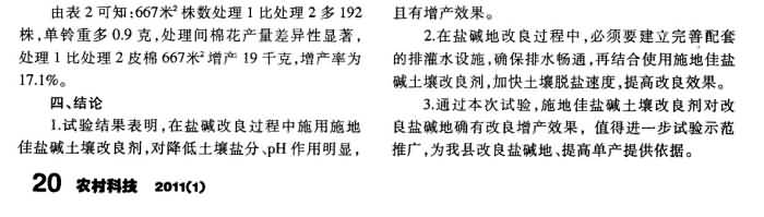 《農村科技》2011年第1期 “施地佳”鹽堿土壤改良劑在棉花上的應用效果試驗