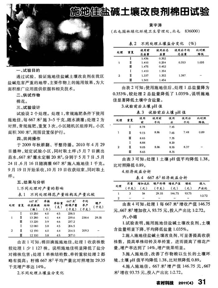《農(nóng)村科技》2011年第4期 “施地佳” 鹽堿土壤改良劑棉田試驗(yàn)