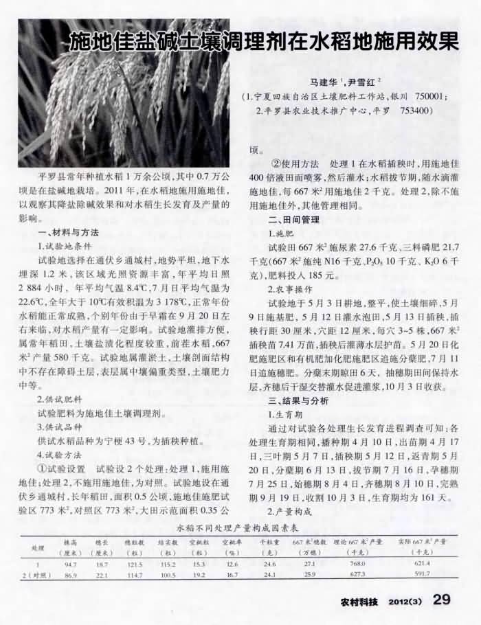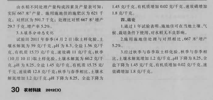 《農(nóng)村科技》2012年第3期 “施地佳”鹽堿土壤調理劑在水稻地施用效果