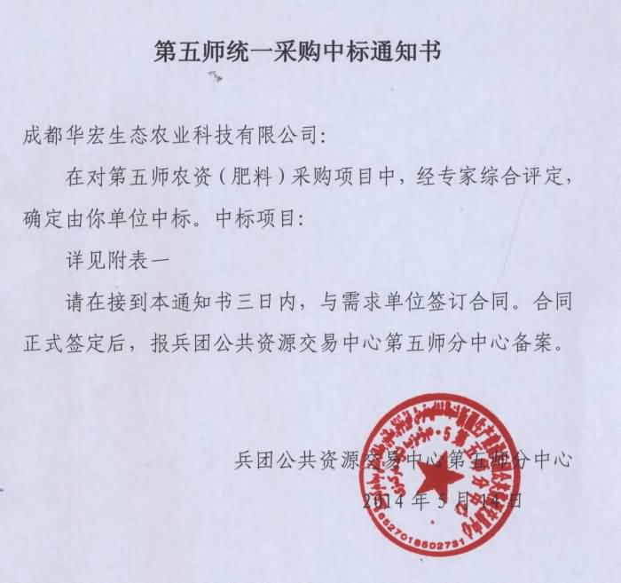 公司產(chǎn)品中標新疆兵團第五師農(nóng)資采購項目