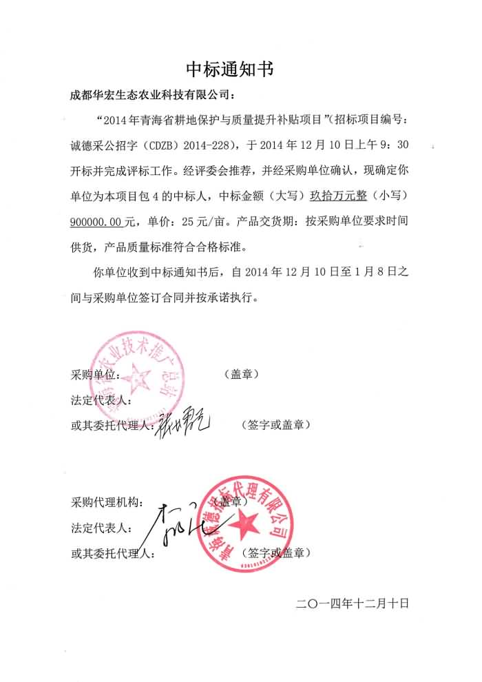2014年12月,成都華宏生態(tài)農(nóng)業(yè)科技有限公司參加青海省農(nóng)業(yè)技術(shù)推廣總站國(guó)家耕地保護(hù)與質(zhì)量提升補(bǔ)貼項(xiàng)目招投標(biāo)競(jìng)標(biāo),經(jīng)評(píng)委推薦、并經(jīng)采購(gòu)單位確認(rèn)我公司為該項(xiàng)目的產(chǎn)品供應(yīng)商,這是我公司連續(xù)3年在青海省中標(biāo)該項(xiàng)目,也是我公司長(zhǎng)期以來堅(jiān)持“質(zhì)量第一,用戶至上”的質(zhì)量和行為準(zhǔn)則的結(jié)果。
