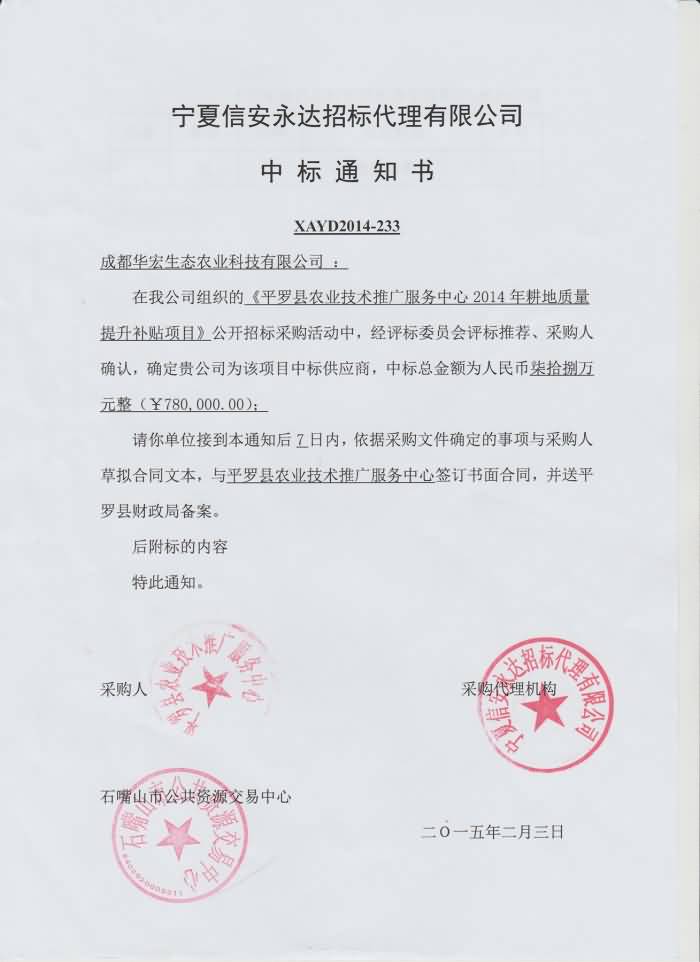 公司產(chǎn)品“施地佳”土壤調(diào)理劑在寧夏羅平縣中標 2015/2/25 華宏生物 成都華宏生態(tài)農(nóng)業(yè)科技有限公司 “施地佳”土壤調(diào)理劑在寧夏羅平縣中標