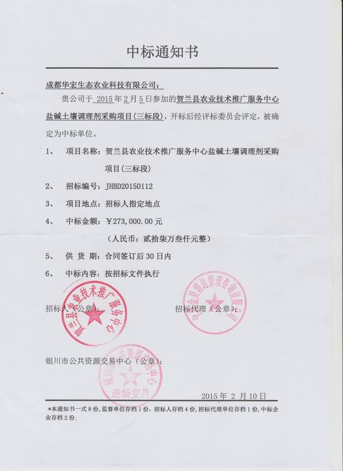 我公司“施地佳”土壤調(diào)理劑在寧夏賀蘭縣中標(biāo)