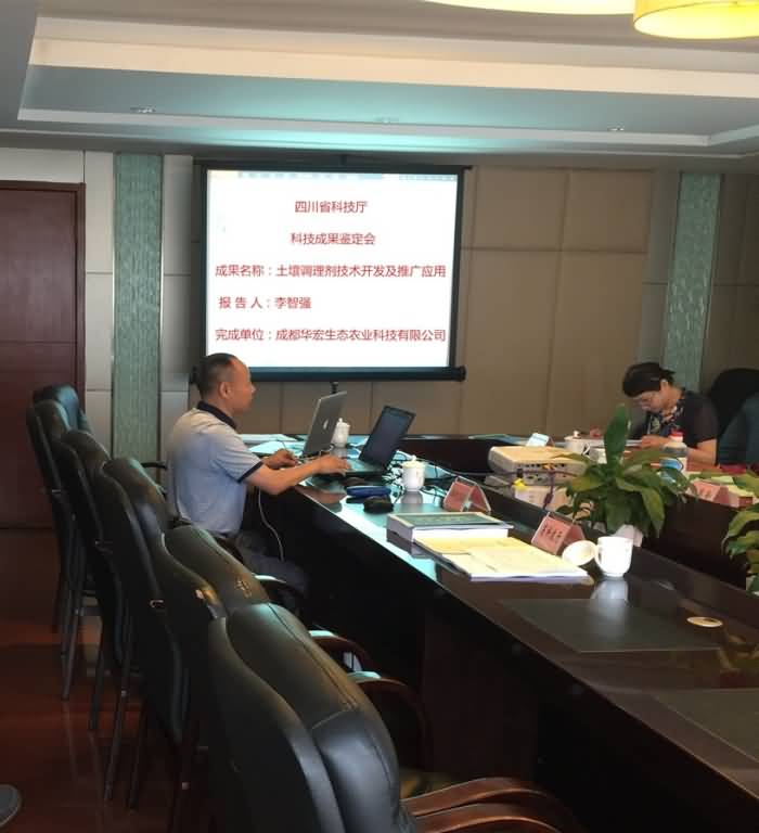 2015年7月7日上午9時,成都華宏生態(tài)農(nóng)業(yè)科技有限公司總經(jīng)理李智強(qiáng)的十年汗水、十年心血研發(fā)的“施地佳”土壤調(diào)理劑科技成果鑒定會在成都市花園賓館四樓會議室舉行,會議由四川省科學(xué)技術(shù)廳負(fù)責(zé)人主持,四川省土壤、肥料、農(nóng)學(xué)、化工方面的專家共7人組成鑒定委員會。由四川省化工研究設(shè)計院院長徐世林(化學(xué)工程高工)任主任,四川農(nóng)業(yè)大學(xué)土壤學(xué)教授、院長王昌全任副主任,四川農(nóng)業(yè)大學(xué)教授艾應(yīng)偉、四川化工行業(yè)協(xié)會理事長曾祥春、四川省危險品化學(xué)品質(zhì)量監(jiān)督檢驗所高級工程師周磊、成都土壤肥料測試中心副主任研究員李昆、中科院水利部成都山地災(zāi)害與環(huán)境研究所研究員張丹(女)為鑒定委員會委員。四川省科技廳康處長首先闡明了會議主題并逐一介紹了與會專家。接著由成都華宏生態(tài)農(nóng)業(yè)科技有限公司總經(jīng)理—“施地佳”土壤調(diào)理劑的主研發(fā)人李智強(qiáng)代表公司向參會專家匯報該成果產(chǎn)品的研發(fā)過程、技術(shù)指標(biāo)、經(jīng)濟(jì)效益、社會效益等情況。