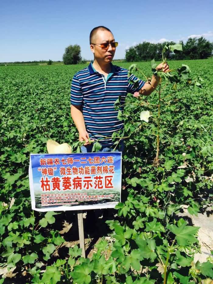 新疆兵團(tuán)農(nóng)七師127團(tuán)是個(gè)老植棉團(tuán)場(chǎng),6連職工付躍發(fā)承包種植的290畝地更是該連棉花黃枯萎病發(fā)生最為嚴(yán)重的地塊。年初在該地簽承包合同時(shí),真是難為了連長(zhǎng)張玉海,土壤病菌多,無人承包,后來地是播下種了,苗出的也很整齊,可棉苗長(zhǎng)到20公分高時(shí)就開始有黃枯萎病癥狀了。眼看就要進(jìn)頭水了,怎么辦呀?連隊(duì)干部們和付躍發(fā)急在心頭。