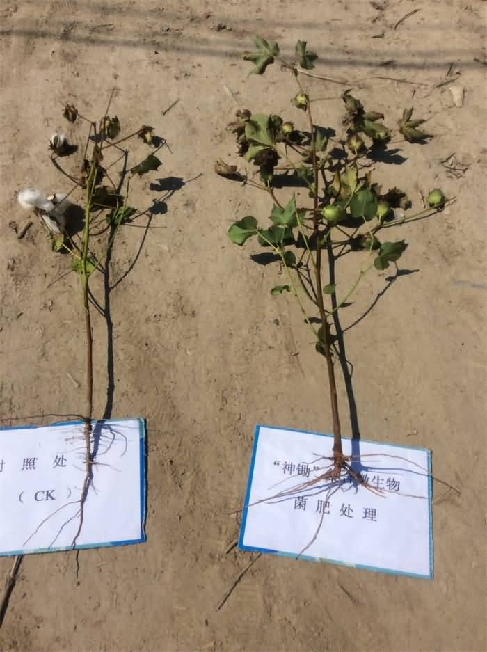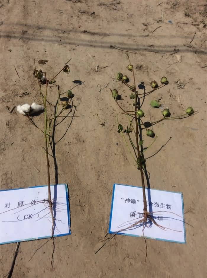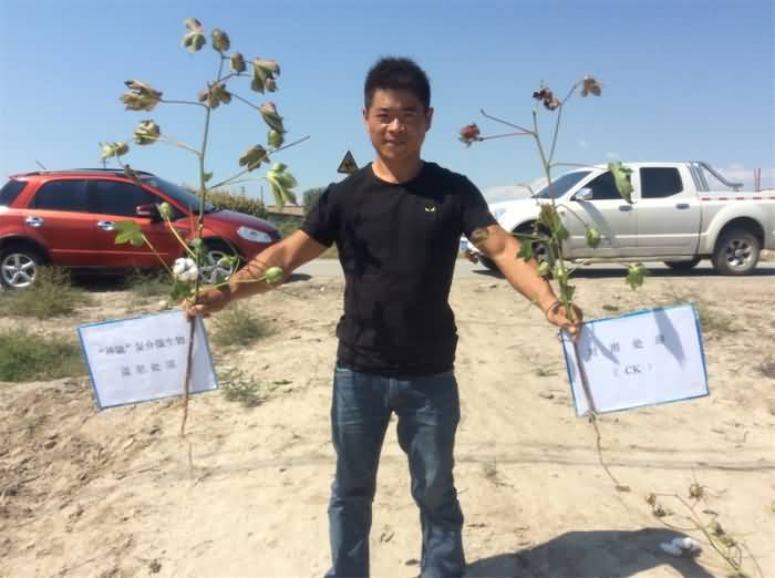 于2014年在博樂市進行的試驗效果也同樣令人稱贊。筆者在實驗報告中看到,該產品在博樂市的試驗田位于該地的達勒特鎮(zhèn),該地塊已連續(xù)種植棉花30年左右,土質同樣為灌耕灰漠土,近些年來棉花枯黃病發(fā)病較嚴重,示范試驗面積為40畝。試驗過程中共設2個處理,在栽培管理條件基本一致的情況下,分別在棉花苗期、蕾期、花鈴期結合滴水,連續(xù)5次每畝每次滴入1公斤“神鋤”枯草芽孢桿菌復合微生物功能菌肥,與相鄰不滴該肥的棉地為對照處理。數(shù)據顯示,與未使用該產品的地塊相比,施用該產品地塊的棉花發(fā)病率降低了23%,每畝增產籽棉62.6公斤,防治病情和增產增收效果出色。