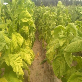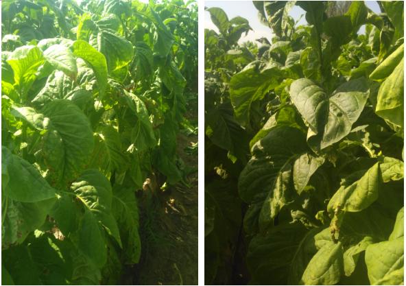從圖10可以看出,成熟期不施用藥劑的煙株受到列當(dāng)影響逐漸嚴(yán)重,后期煙株已經(jīng)萎縮,而施用藥劑的煙株也有缺鉀的現(xiàn)象但未對煙株造成影響,也開始分層落黃。