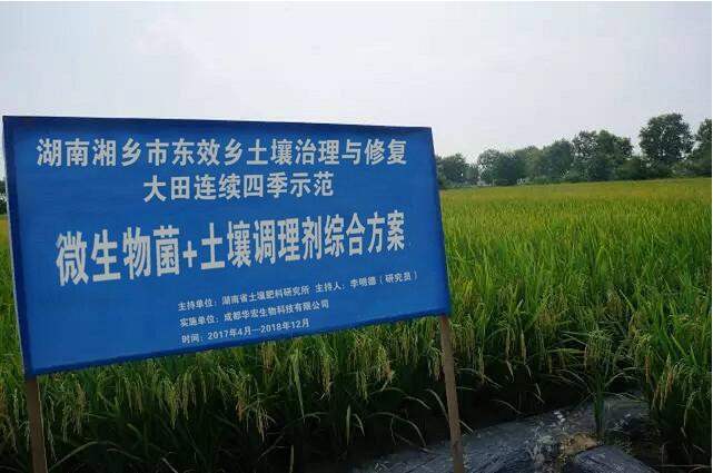 事實上,和人體一樣,土壤在長期遭受鎘等重金屬污染的情況下,同樣會出現(xiàn)各種問題,直接導(dǎo)致土地活力下降,肥力減弱,進而影響產(chǎn)量和農(nóng)產(chǎn)品品質(zhì)。早在2015年,成都華宏生物公司就在湖南省湘鄉(xiāng)市晚稻小區(qū)實驗,降鎘幅度達到37.3%。2016年,2016年連續(xù)兩季的小區(qū)實驗,早稻稻米降鎘幅度51.8%,晚稻稻米降鎘幅度達46.4%。2017年進行連續(xù)兩季的大田示范。在李明德研究員的帶領(lǐng)下,技術(shù)團隊選擇湘鄉(xiāng)市東郊鄉(xiāng)田園村9組農(nóng)戶辜梅芳承包的水稻責(zé)任田為試驗地,由于供試土壤為第四紀(jì)紅色粘土發(fā)育的紅黃泥,質(zhì)地為粘壤土,肥力中等均勻,排灌方便,種植水平與當(dāng)?shù)厣a(chǎn)水平相當(dāng),近年未做過肥料試驗,十分具有參考性。